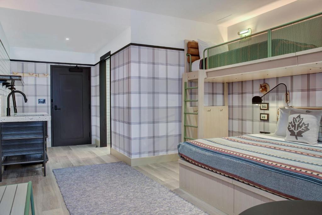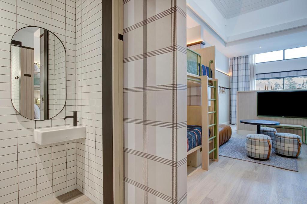 The Moxy Banff is a brilliantly renovated, upgraded and re-branded property sitting adjacent to the Canalta Lodge and just opposite the Hotel Canoe & Suites. It forms the third part of what will soon be a core of four hotels at the end of Banff Avenue (the 4th part will be the new Otter Hotel opening shortly - watch this space). The Moxy brings a cool mid-Century vibe to Banff - the styling is on point and the whole experience is different. It's based around a community feel where the main communal spaces are big, spacious, inviting and social. You check-in at the hotel's retro race-track shaped bar - and they give you a welcome cocktail. The rooms are excitingly fresh with a very interesting design thread pervading throughout. As you'd expect, there's a pool, hot tub and outside seating area with firepit. Other facilities include a VW campervan in the lobby serving food and drink as a food truck, a grab'n'go cafe, plus a very cool private media room which can be booked to view movies or listen to music.