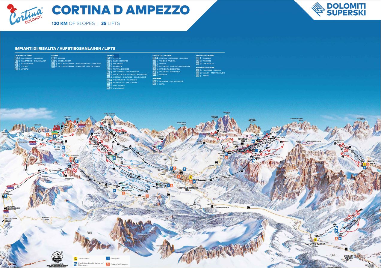 The 120km of slopes in the local area of Cortina d'Ampezzo are split into three main sections, the most extensive of which is on the Tofana side. The iconic Olympia delle Tofane piste will be instantly recognisable to followers of ski racing as the most spectacular descent in the women's World Cup with the jagged rocks of the Dolomites jutting out either side of the run. Further options are available from the Faloria lift, offering a great variety for intermediate skiers including lovely tree-skiing and higher, more open terrain boasting stunning, lofty views. Beginners will enjoy the blue runs above Socrepes and there is a good variety of ski schools offering group and private tuition. More adventurous skiers can take a day trip over to Alta Badia via the 5 Torri - Lagazuoi area which links into the larger Sella Ronda circuit. The links are a little convoluted but where there's a will, there's a way!