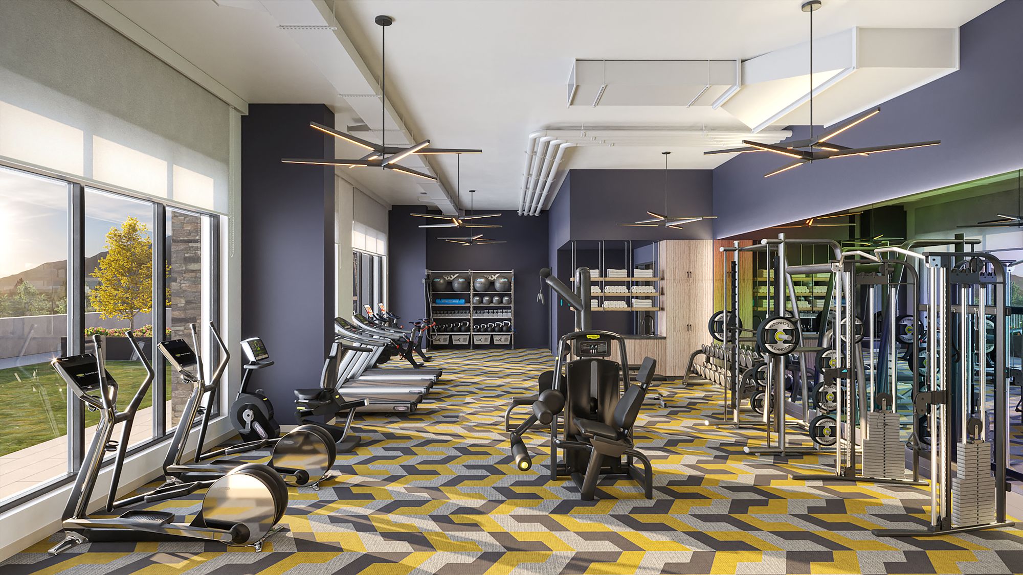 - Fitness Room with Peloton bikes, elliptical machines, treadmills and free weights